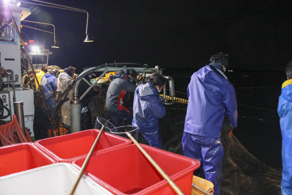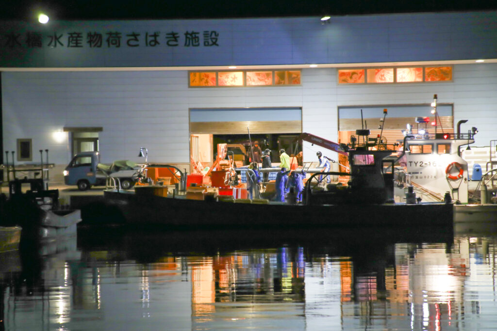 夜明け前、一般立ち入りが許されていないホタルイカ水揚げ漁港へ特別に漁師がご案内。
