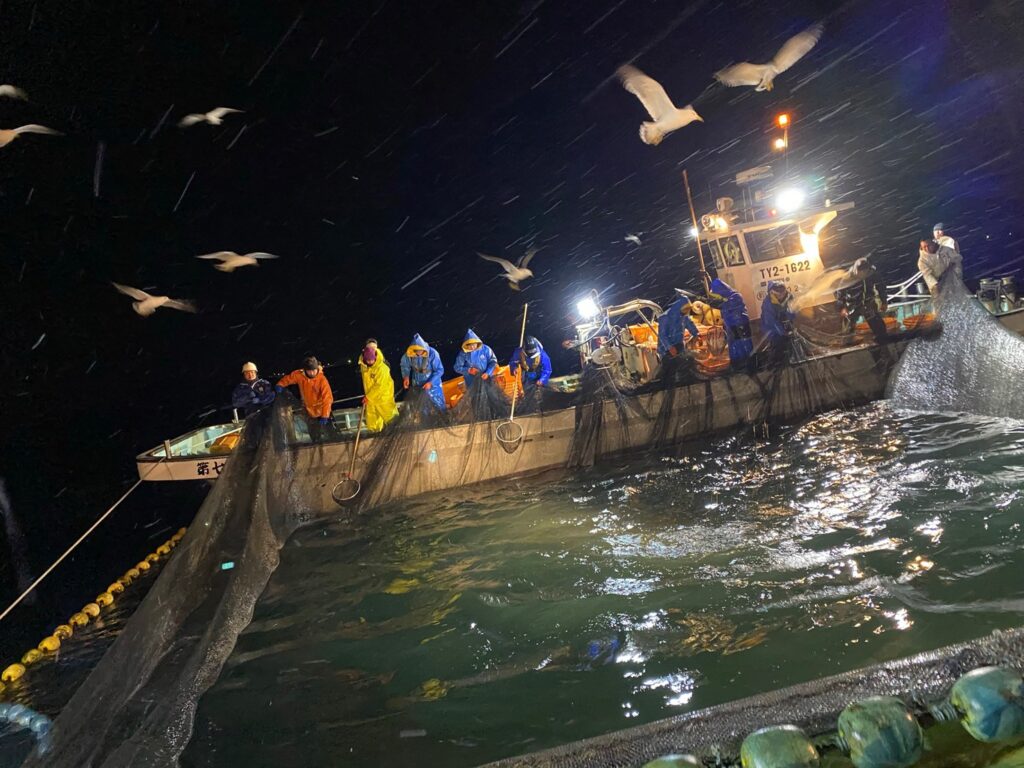 船の出航は夜明け前。まだあたりが暗い中、水橋の漁師たちが乗り込む船は沖合1Kmほどに設置した定置網を目指します。定置網は『待つ漁法』と言われ、「越中式定置網漁」は富山発祥とされています。